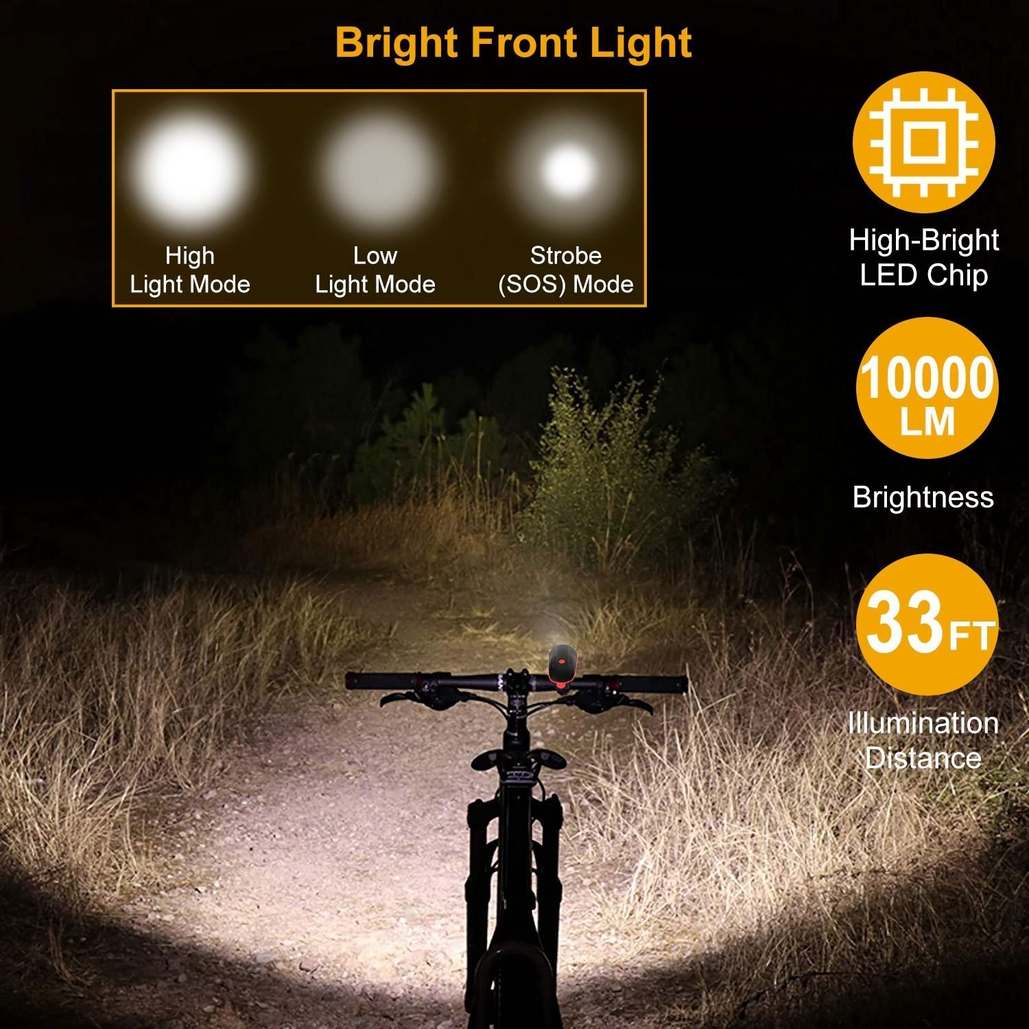 **10000LM LIGHTING PERFORMANCE FOR SAFE CYCLING*:Both adopting high-bright LED chip; the bike front bight can provide up to 10000lm high brightness to illuminate the road forward within 33ft long range while the bike rear light can warn the vehicles or pedestrians behind you effectively.