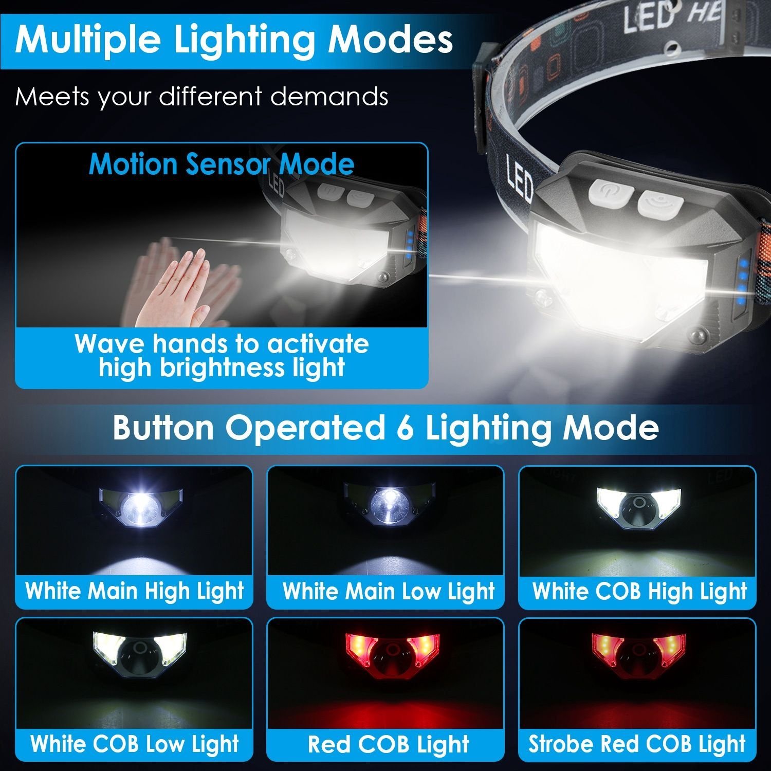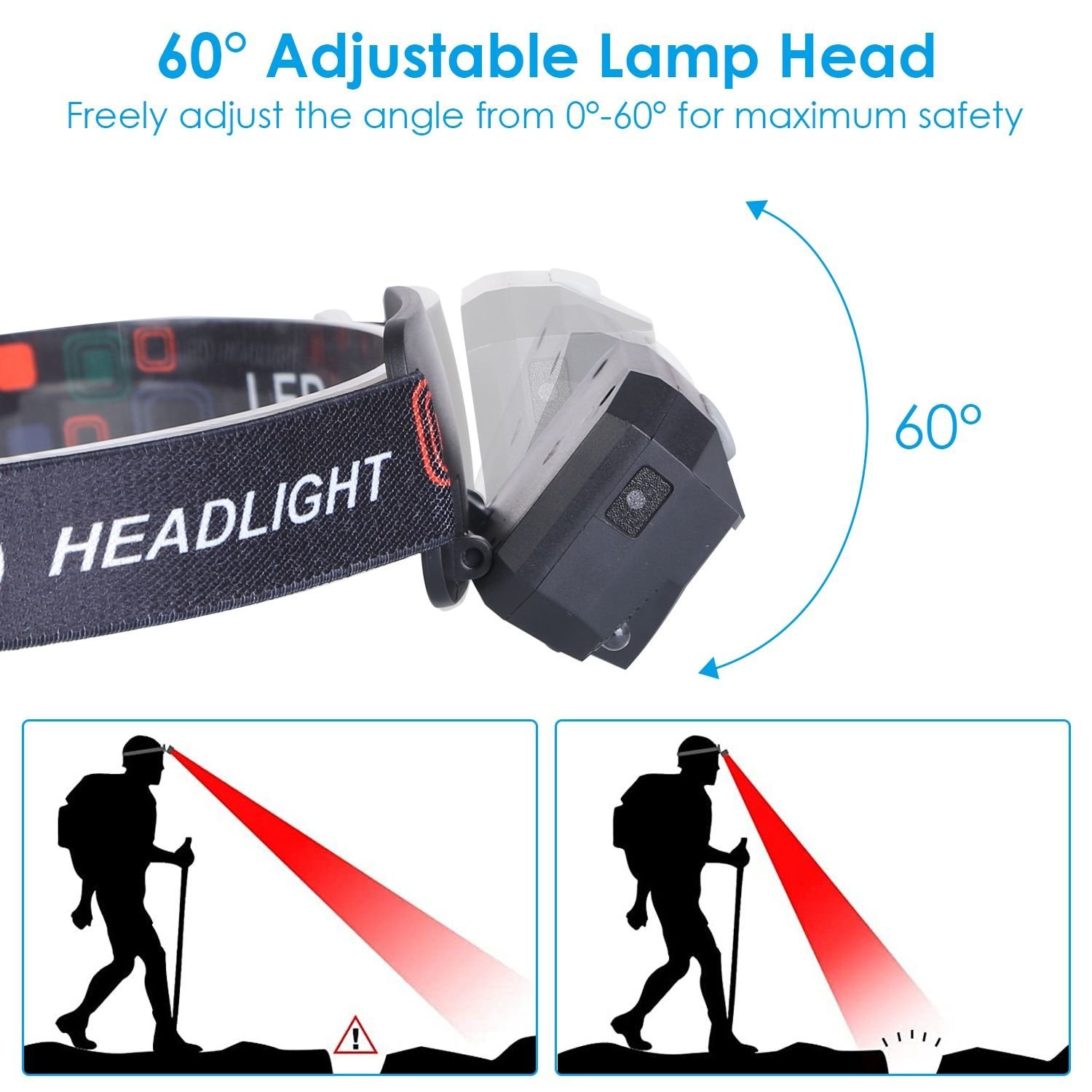 *6 Light Modes*:This headlamp is equipped with 6 light modes; including high brightness white main light; low brightness white main light; high bright white COB light; low bright white COB light and red LED light(steady on/flashing). Short pressing the switch button to cycle through various modes and meet your various needs. Besides; you can rotate the lamp head from 0°- 60° to adjust the lighting angle.