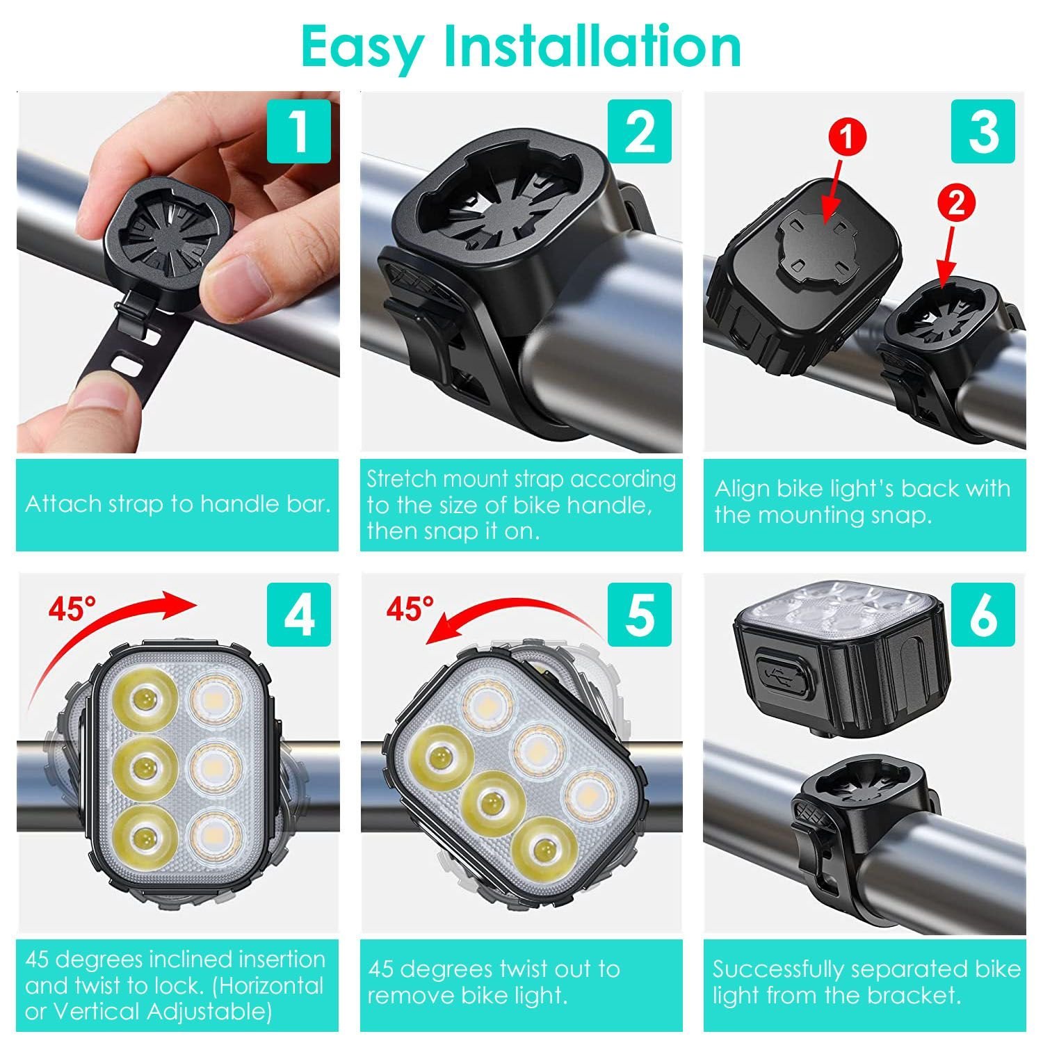 *Easy Installation*:Without any tools,our bike lights can be installed even by children in seconds. The lights can be fixed in horizontal or vertical ways accordingly. 3 simple steps offer long runtime.