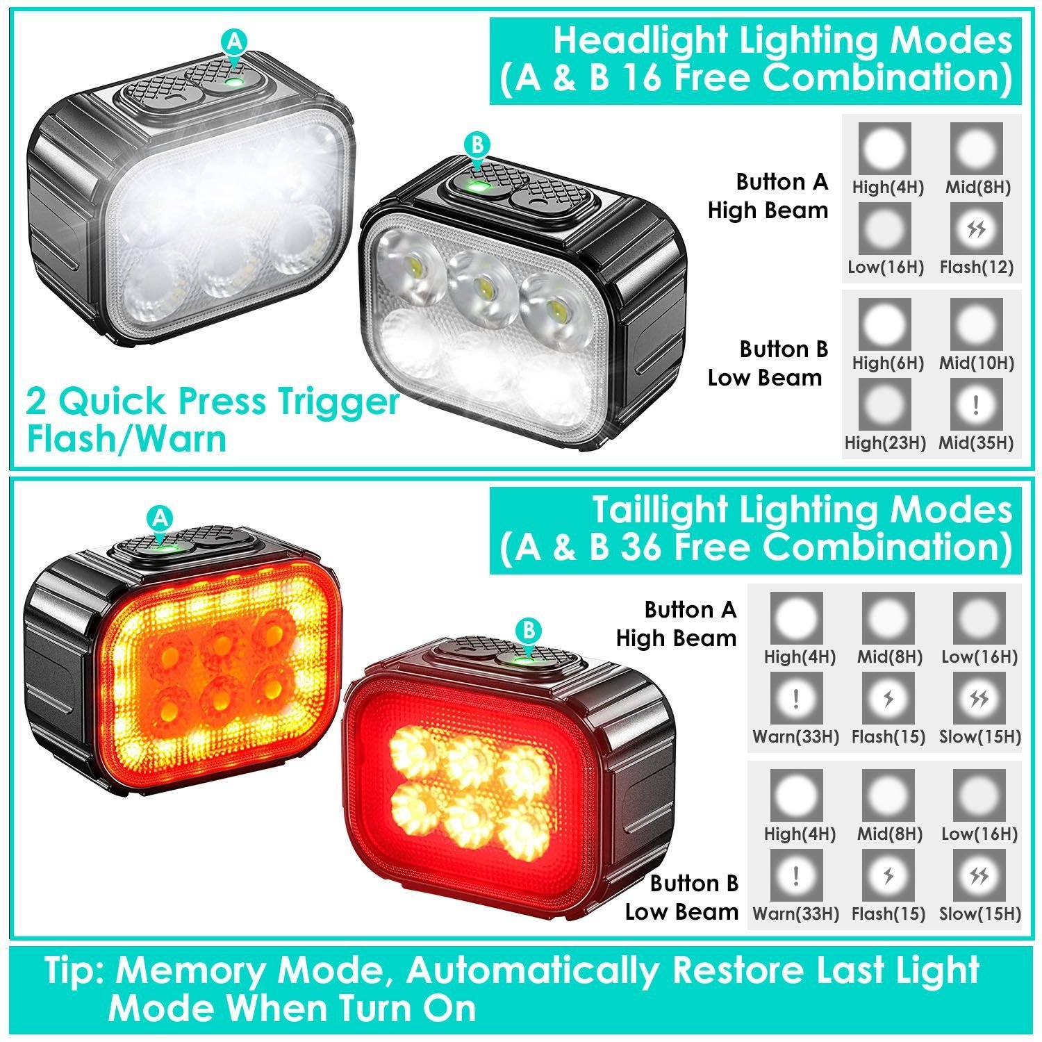 *Multiple Lighting Modes*:Due to two independent light controls,our bicycle light provides single and combined light modes. The highlight mode illuminates your dark path at night,and warn mode draws the attention of passerby and driver. No need to worry about night riding safety. Multiple modes easily meet your different needs.