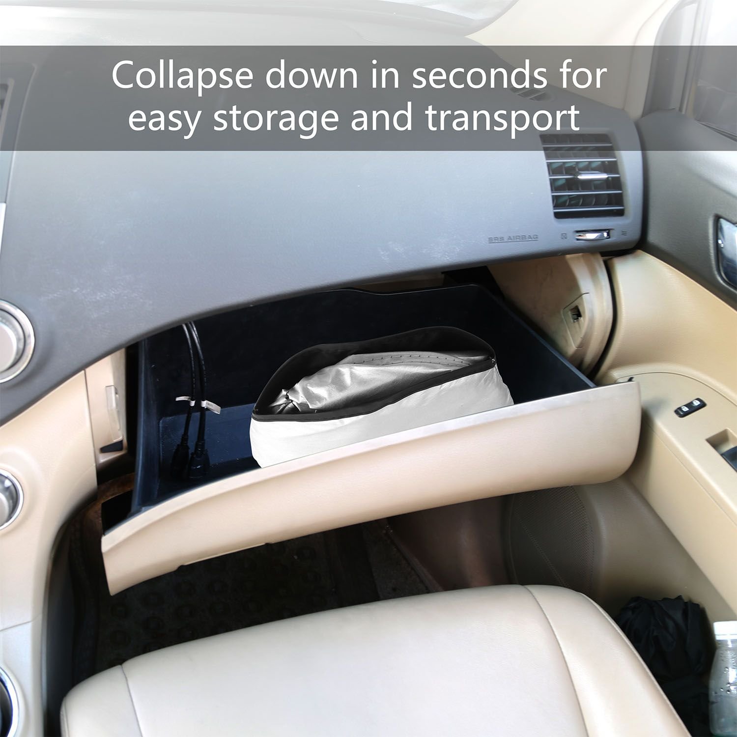 Easily collapse down to 9.84' x 9.84' so that you can stash it in the glove compartment or overhead compartment