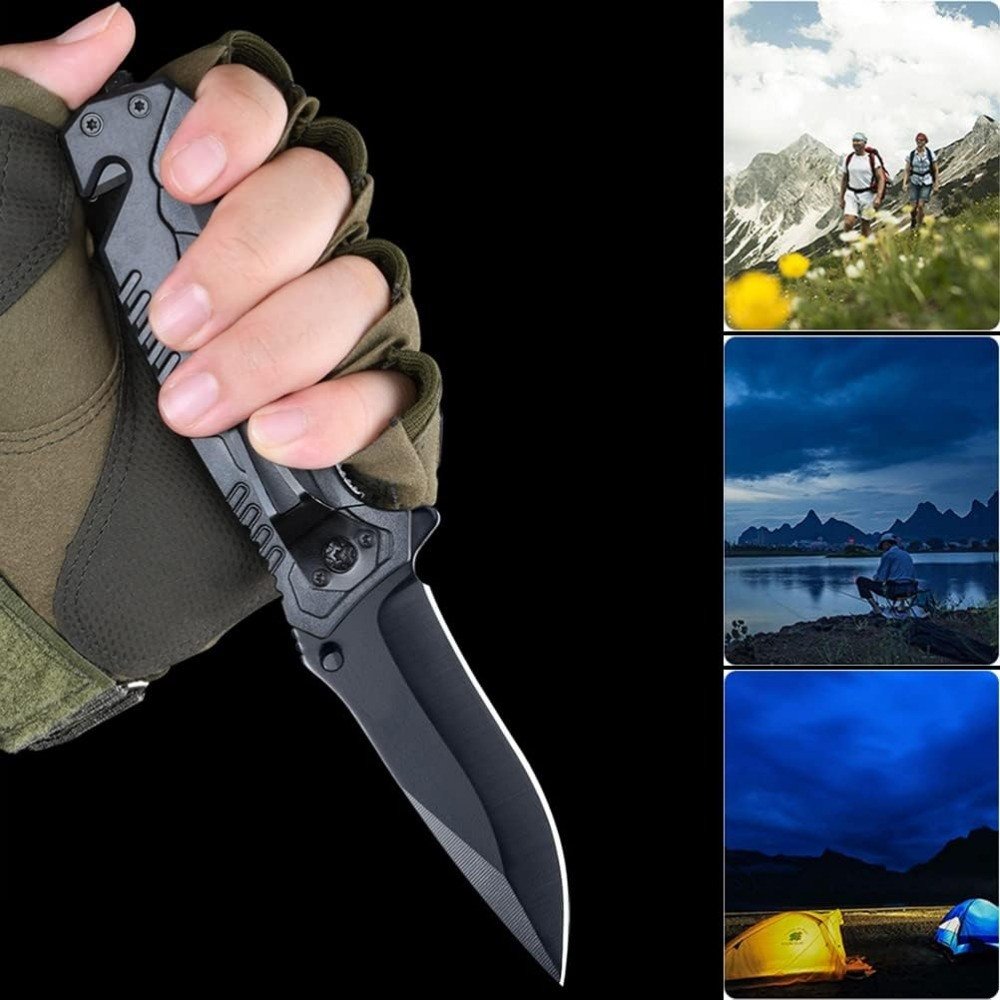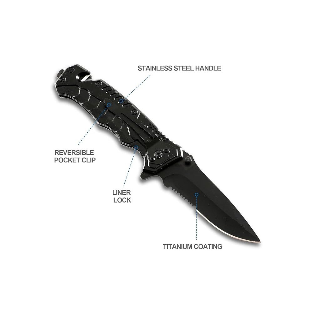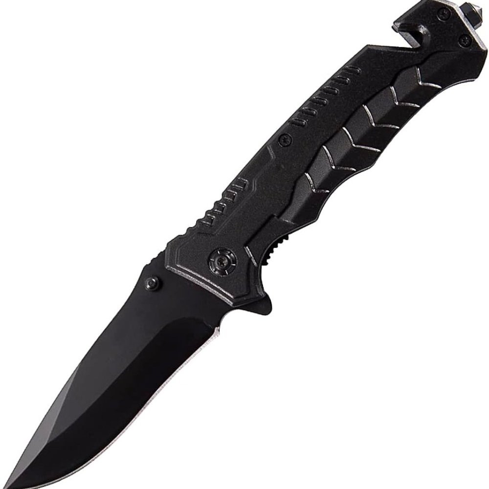 1.Black pocket knife with Stainless Steel blade and aluminum ergonomic handle. Handle have unique non-slip grip design for manipulating ease and comfort grip.