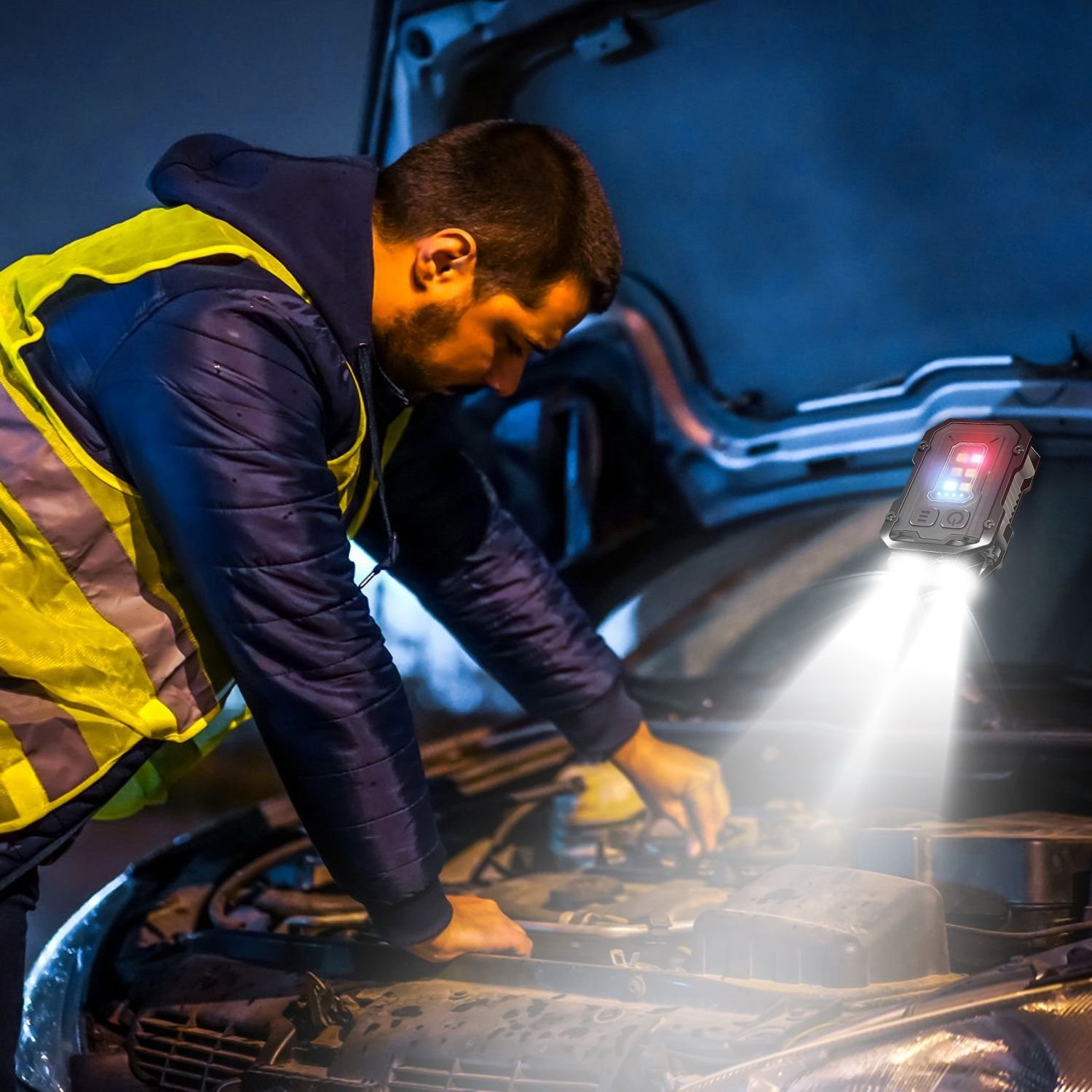 *Clip & Magnetic Design*:This LED work light has a magnetic base,which can firmly attach to various metal surfaces like car hood or steel shelf while repairing. Our rechargeable keychain flashlight features a back clip that allows you to attach it to belts,tool bags,or tent tops,freeing your hands.