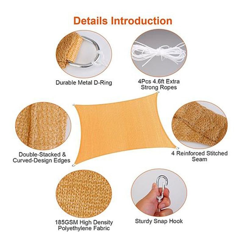 1.Designed with mesh woven shape, the rectangle shade sail is water and air permeable, allowing water and air to go through freely, ensuring cool enough under the sail no matter if it\'s a rainy or windy day.