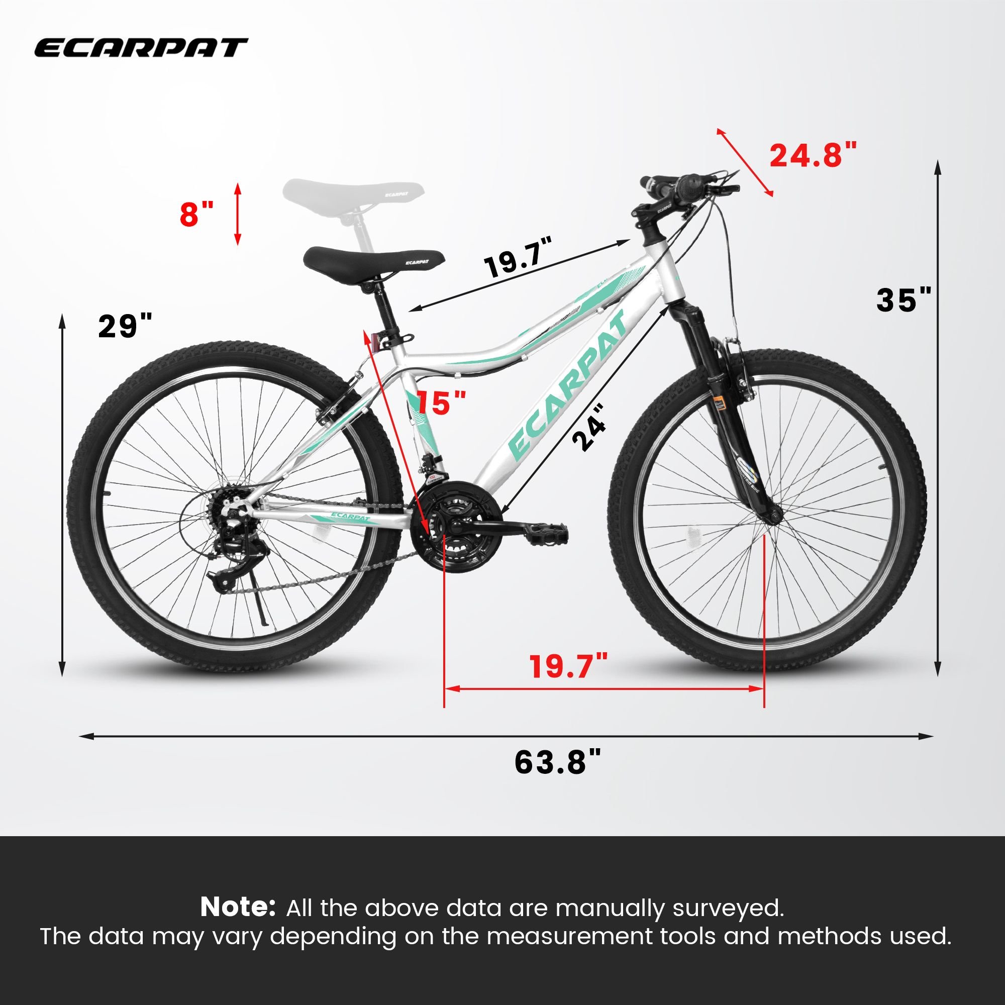 [Premium Frame Shock Absorbing Design]24x15 inch modern design carban steel durable frame. Sized for men womens height 4'2"-4'9"(50-57 inches), max weight is up to 250lbs. Feature 100mm front suspension fork. The thickened frame and shock absorbers help resistant and absorb shocks. The parallel bars can adapt to pressure road conditions.Greatly improve the comfort during riding and allows you to enjoy riding.[21 Speed Drivetrain]- Allows riders to switch gears with smoothness. The positioning is accurate, and silky gear shifts without stalling. The riders can select gears for various terrains quickly.