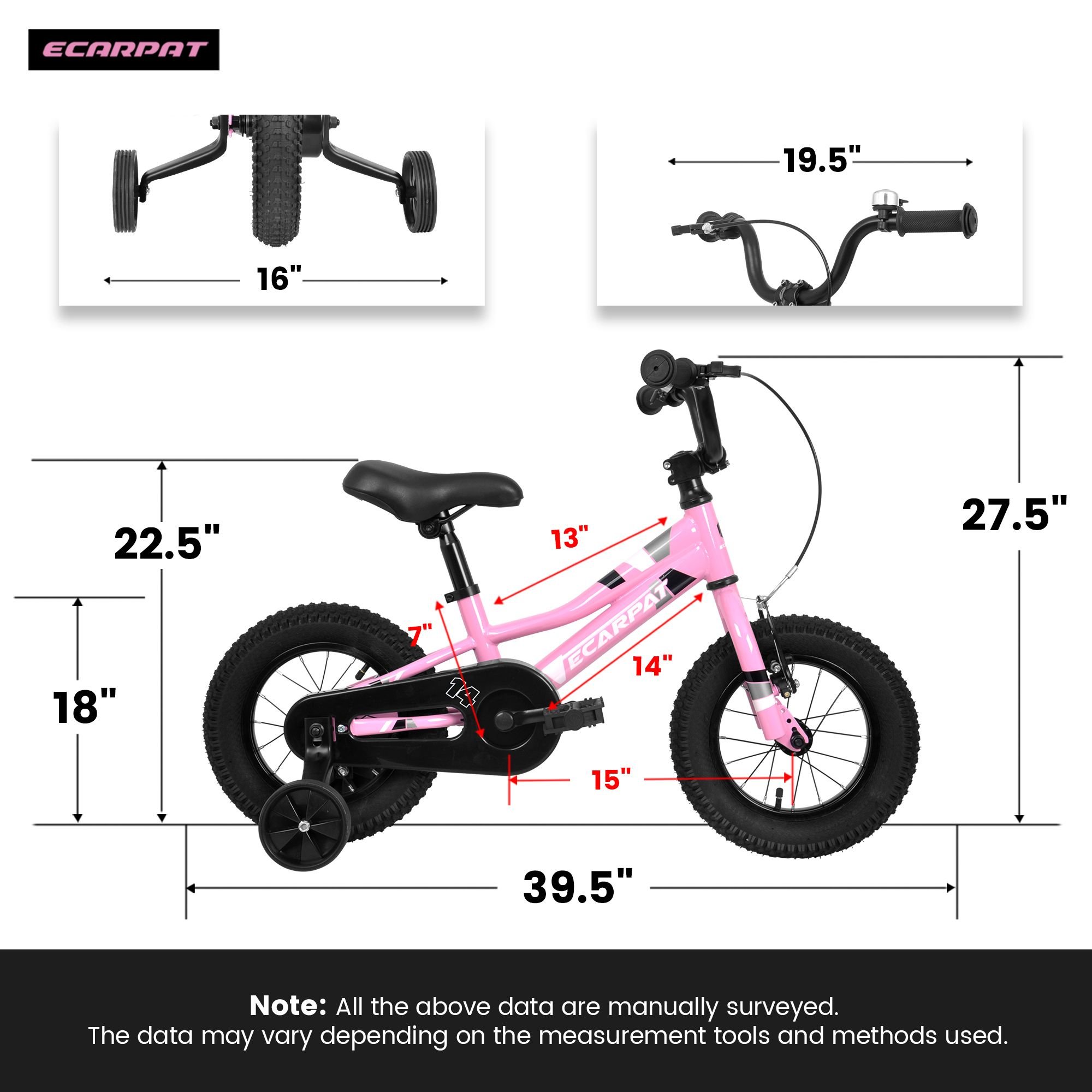[Designed for Children]14x2.35'' tires bike designed for children 3 - 5 years old or 38'-45'(95-115cm) tall. Durable high carton steel construction provides long-lasting reliability. It can withstand the rough and tumble adventures of childhood.[Stable Training Wheel]Training wheels come with 14 inch bikes, have triangular stability to help kids learn to ride quickly, providing a guarantee for their safety.[Safety Protection]Coaster foot brake and V-brake make it easy to learn. It is suitable for small kids who don’t have enough power to control brake by hand. Enclosed chain guard to protect kids’ hands, feet, and clothing.[Accompany Child's Growth]Designed ergonomically, the adjustable saddle can accommodate children of different ages. Saddle handle for parent support for learning.[85% Pre-Assembled]With instruction manual and assembly tools. It is very easy to assemble. You need to assemble the handlebar, saddle, front wheel, pedals and training wheels. Please note that if you have any questions, you could contact our customer service first.