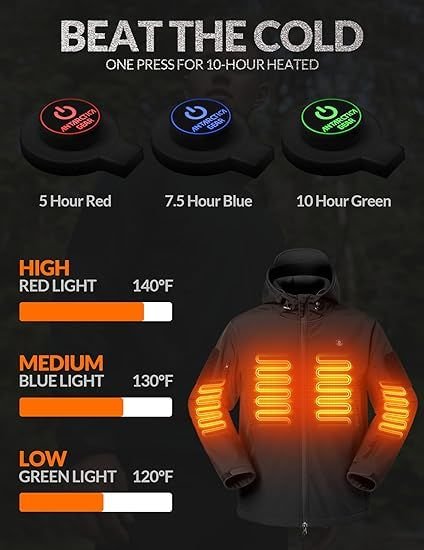 THREE HEATING LEVEL & DUAL CONTROL BUTTONS: 3 Heating levels (high, medium, and low). Change the heat setting of your jacket with a simple press of a button. Our battery can work up to 10 hours / 120℉ at a low level, 7.5 hours / 120℉ at a medium level, and 5 hours / 140℉ at a high level.